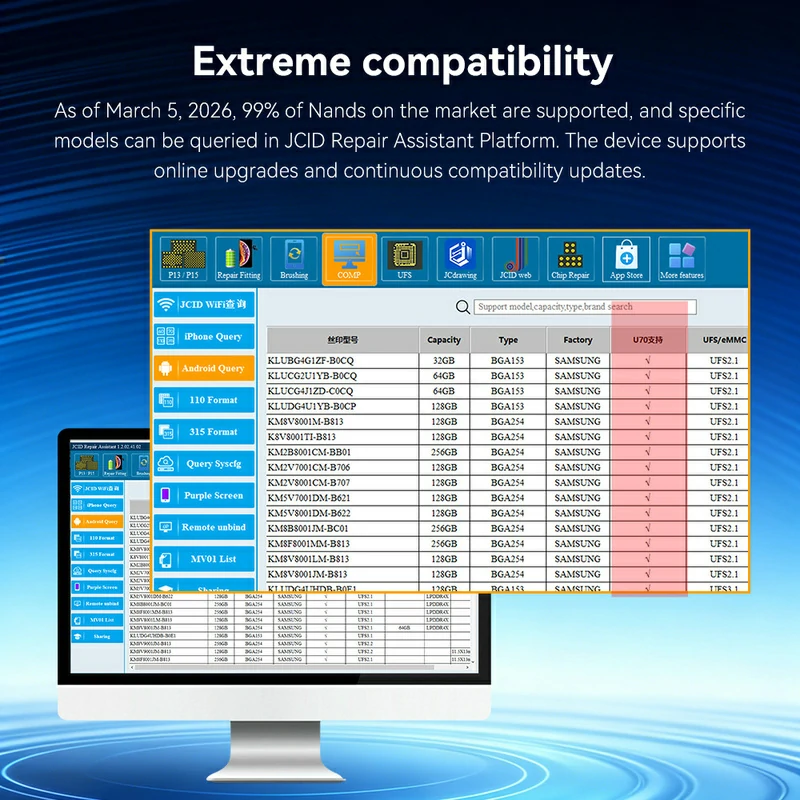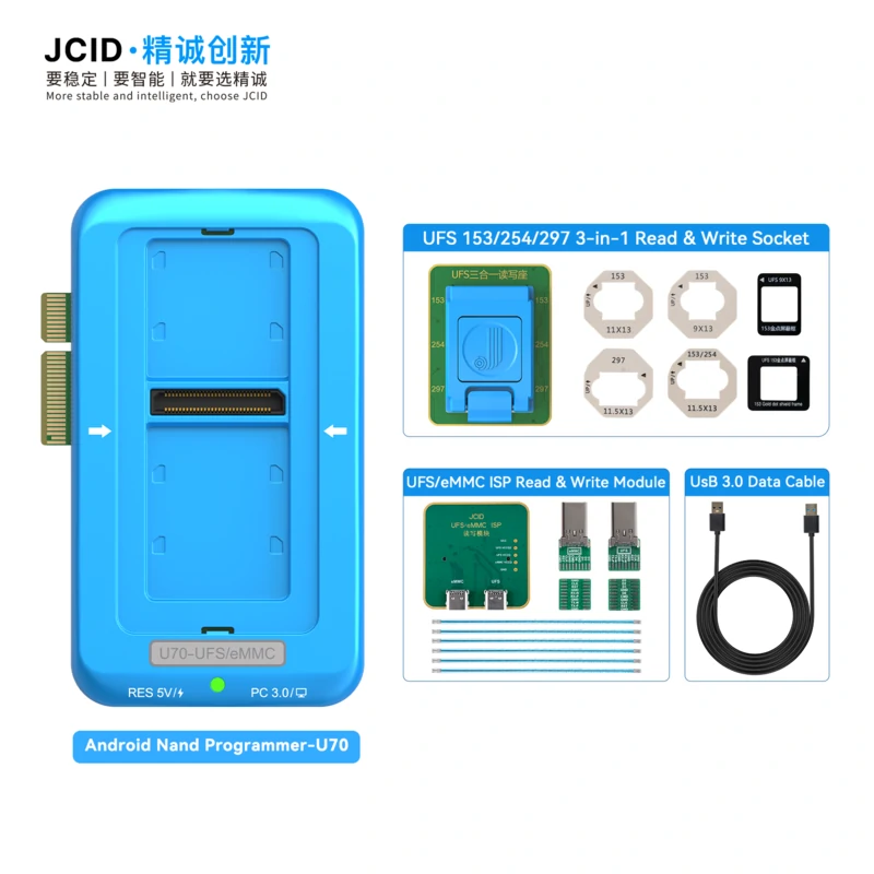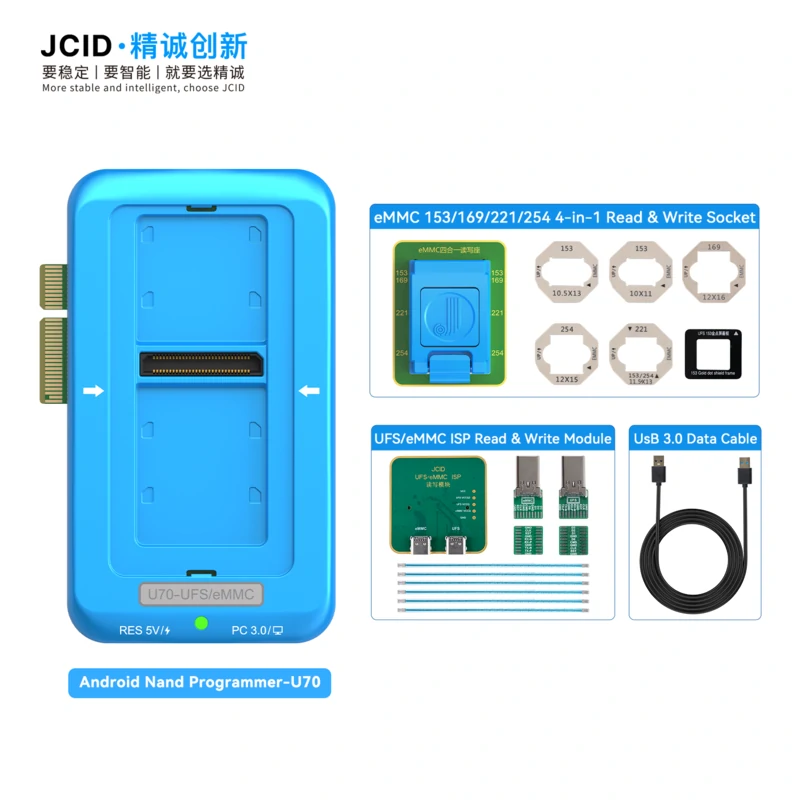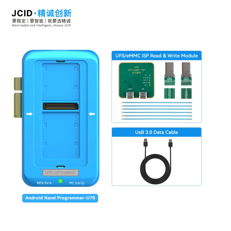 The JCID U70 Gen2 Android NAND Programmer is a powerful Nand repair and programming solution designed for UFS, eMMC, and ISP storage chips. Built for professional technicians, it supports flexible host and module configurations, including UFS 153/254/297 and eMMC 153/169/221/254 multi-in-one sockets, as well as UFS/eMMC ISP read-write modules. With USB 3.0 high-speed transmission, the device delivers up to 250MB/s read speed and 350MB/s write speed, significantly reducing data processing time. Compatible with major storage brands such as SanDisk, Samsung, Toshiba, Micron, YMTC, HiSilicon, and SK hynix, the U70 supports up to 99% of NAND chips on the market and provides continuous compatibility through online upgrades. Ideal for Android phone storage expansion, RAM upgrades, repair system failures, fix drones camera calibration errors, vehicle NAND repair, and all devices using UFS and eMMC Nands, such as set-top boxes, etc. The U70 offers a fast, flexible, and reliable solution for advanced NAND programming and data recovery.