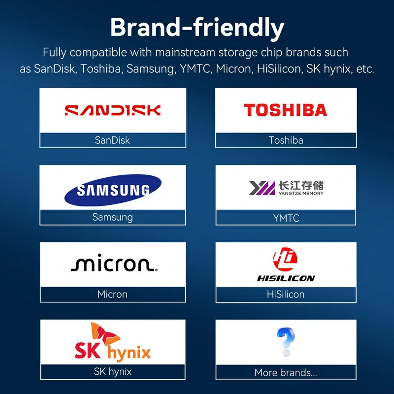 • Brand-friendly: Fully support SanDisk, Toshiba, Samsung, YMTC, Micron, HiSilicon, and more