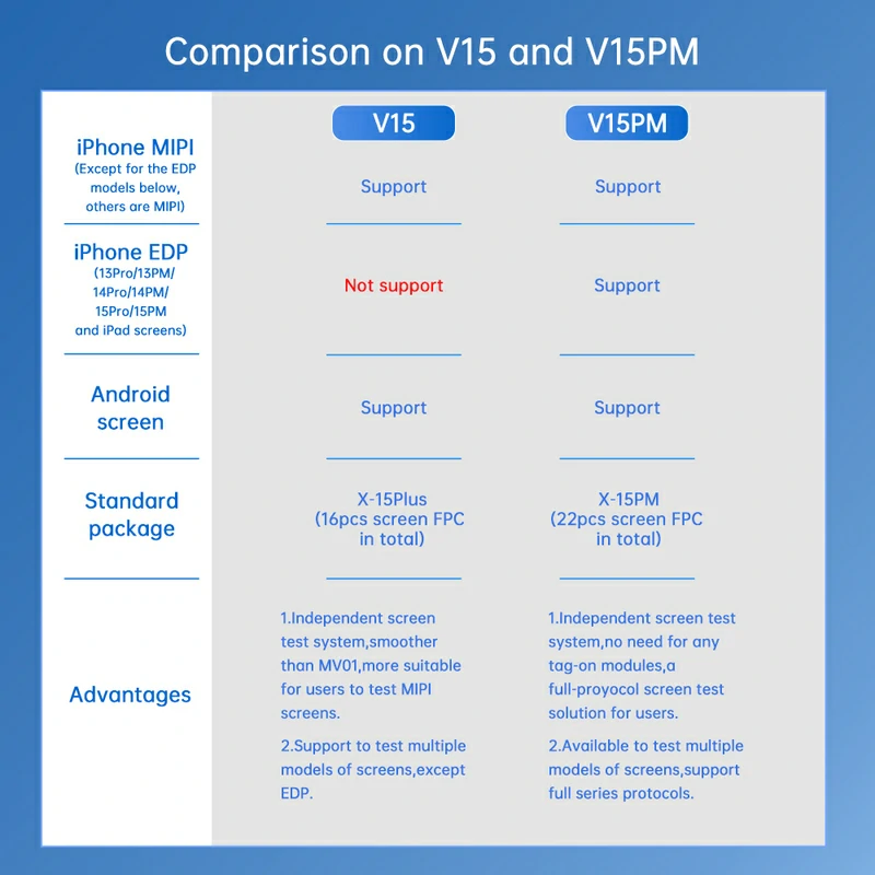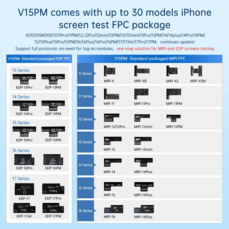 The JCID V15PM screen tester integrates MIPI and EDP interfaces, making it compatible with thousands of phone models for comprehensive screen testing. It supports color, image, touch, and refresh rate tests for brands like Apple, Huawei, Samsung, Honor, OPPO, VIVO, and Xiaomi. With its independent system, there's no need for additional modules. The V15PM fully simulates mobile phone testing logic and displays touch traces on high refresh rate screens, providing an ultimate testing experience as smooth as the actual device.