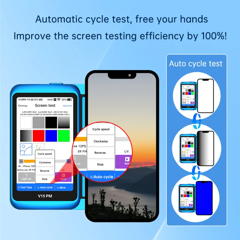 • Automatic cycle test, free your hands. Improve the screen testing efficiency by 100%!
